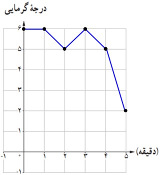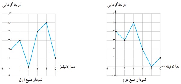 یک اجاق دارای دو منبع گرمایی قابل تنظیم است که می توانند هم زمان، به طور مستقل و جدا از هم گرما تولید کنند. نمودار دمایی که این دو منبع گرمایی تولید می کنند، به صورت زیر است. این نمودارها نشان می دهد که در عرض 5 دقیقه، چگونه مقدار دما افزایش و یا کاهش می یابد. با توجه به نمودارهای زیر بیشترین و کمترین دمایی که در این اجاق تولید می شود چه مقدار است؟