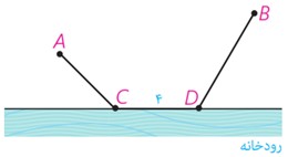 ب دو شهر A و B مطابق شکل در یک طرف رودخانه ای واقع اند. می خواهیم جاده ای از A به B بسازیم به طوری که 4 کیلومتر از این جاده در ساحل رودخانه ساخته شود. این 4 کیلومتر را در چه قسمتی از رودخانه بسازیم تا مسیر ACDB کوتاه ترین مسیر ممکن باشد؟