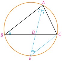 در مثلث ABC برای محاسبهٔ طول نیمساز داخلی زاویهٔ \(({\hat A_1} = {\hat A_2})\,\,\hat A\)، یعنی AD ، AD را امتداد می دهیم تا دایرهٔ محیطی مثلث را در E قطع کند و E را به C وصل می کنیم.