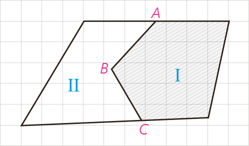 الف در شکل دو مزرعهٔ I و H متعلق به دو کشاورز است. این دو کشاورز برای استفاده از ماشین های کشاورزی می خواهند مرز مشترک ABC بین دو زمین خود را به یک پاره خط مستقیم تبدیل کنند به طوری که مساحت های زمین های آنها تغییر نکند. چگونه شما می توانید این کار را برای آنها انجام دهید؟