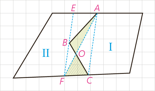 الف زیرا دو پاره خط BF و AC موازی و BC و AF یکدیگر را در نقطه O قطع کرده اند. پس بنا به قضیه قبل :