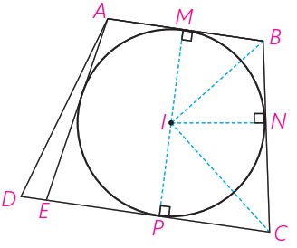 نیمسازهای دو زاویهٔ B و C همدیگر را در نقطه ای مانند I قطع می کنند. با توجه به ویژگی نیمساز، چرا نقطهٔ I از سه ضلع CD و BC و AB به یک فاصله است؟ (IM=IN=IP) چرا دایره ای به مرکز I وشعاع IM بر AB و BC و CD مماس است؟ حال اگر این دایره بر AD هم مماس باشد، حکم ثابت شده است.