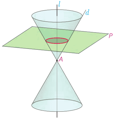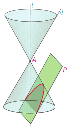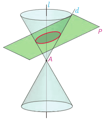ب در حالتی که صفحهٔ P بر محور l عمود نباشد و با مولدِ d نیز موازی نباشد و تنها یکی از دو نیمه مخروط را قطع کند، سطح حاصل یک بیضی خواهد بود.