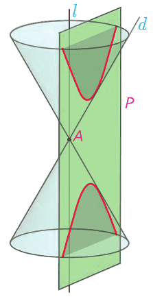 ت اگر صفحهٔ P به گونه ای باشد که هر دو تکهٔ بالایی و پایینی سطح مخروطی را قطع کند و شامل محور l نباشد، در این صورت فصل مشترک صفحه و سطح مخروطی یک هذلولی است. در این کتاب به تعریف دقیق و بررسی خواص هذلولی نخواهیم پرداخت.