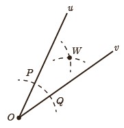 الف زاویۀ uOv را درنظر بگیرید. به مرکز O و به شعاع دلخواه کمانی رسم کنید تا نیم خط های Ou و Ov را در نقاطی مانند P و Q قطع کند.