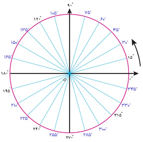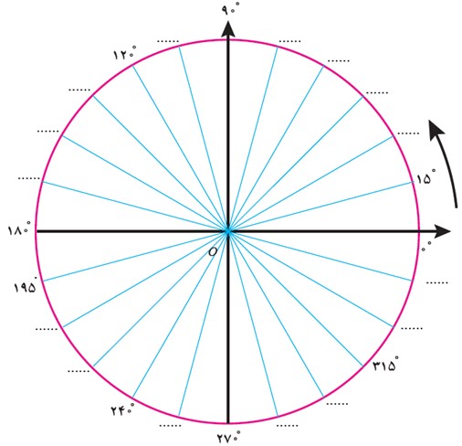 شکل مقابل یک دایرهٔ مثلثاتی را نمایش می دهد که به 24 قسمت مساوی تقسیم شده است. در جاهای خالی زاویهٔ مناسب را روی شکل مشخص کنید.