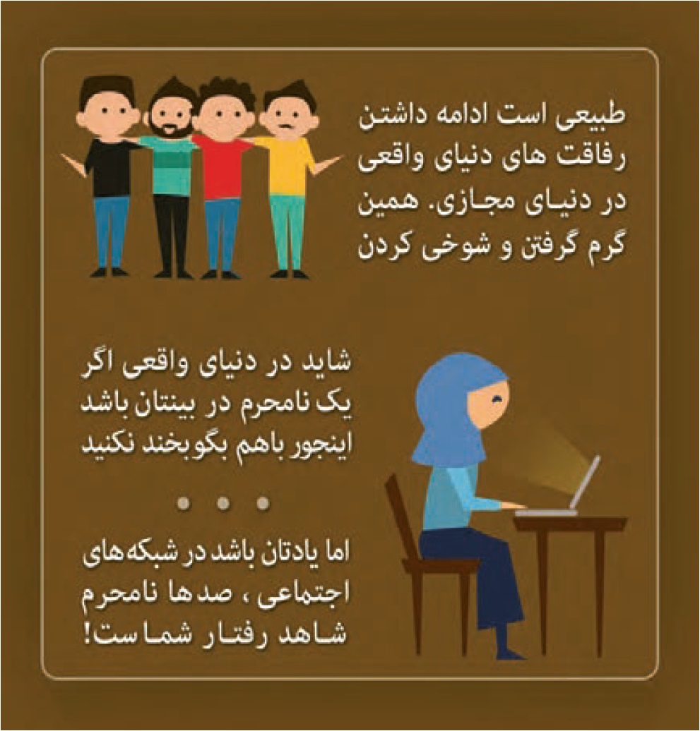 در این تصویر می بینیم که بایستی در ارتباط های با نامحرم ها در شبکه های اجتماعی دقت داشته باشیم. شاید اگر بعضی شوخی هایی که در بین دوستان مان انجام می دهیم را در کنار نامحرمی انجام ندهیم، اما همان شوخی کردن یا گرم گرفتن در بستر شبکه اجتماعی ممکن است در مقابل یک نامحرم رو مهم ندانیم.