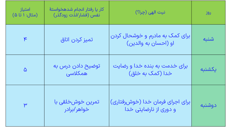 شما باید به مدت دو هفته، آموختههای خود درباره رنگ الهی دادن به کارها (داشتن نیت الهی) را تمرین کرده و دستاوردهایتان را به صورت زیر ثبت کنید: