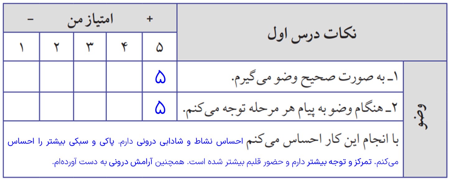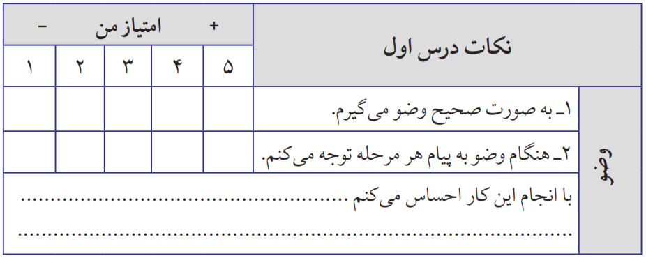 حاج آقای محمدی بعد از نماز، به اهالی مسجد گفت:« اگر می خواهید نماز، اثر واقعی خودش را داشته باشد، بهتر است هنگام نماز حواستان به نکاتی که می گویم باشد. شبی یک نکته از نماز می گویم؛ سعی کنید به آن توجه کنید.» بیایید ما هم همراه اهالی مسجد، هر نکته ای را که می آموزیم، در نمازهای خود به کار ببندیم و آن را در جدول زیر ثبت کنیم. برای ادامهٔ کار می توانیم در پایان هر درس جدولی مشابه این جدول طراحی کنیم