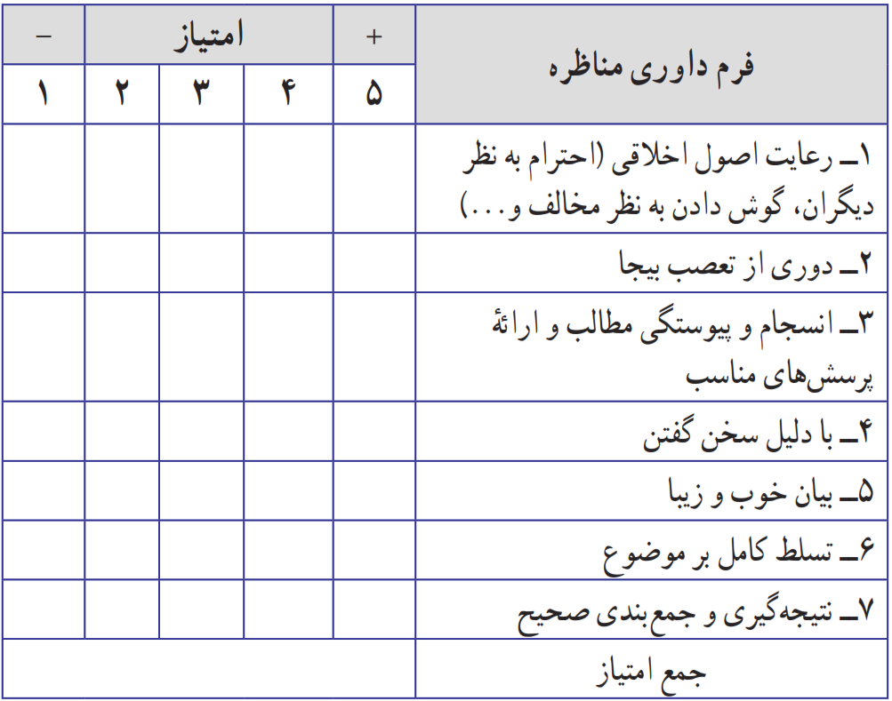 یکی از شیوه های دفاع از توحید، مناظره است که با آن آشنا شده اید. اکنون دو گروه سه نفره تشکیل دهید و برای موضوع داده شده یا موضوع آزاد، مناظره ای در کلاس اجرا کنید. معلم و سایر دانش آموزان نیز مناظرهٔ شما را طبق جدول زیر، داوری خواهند کرد.