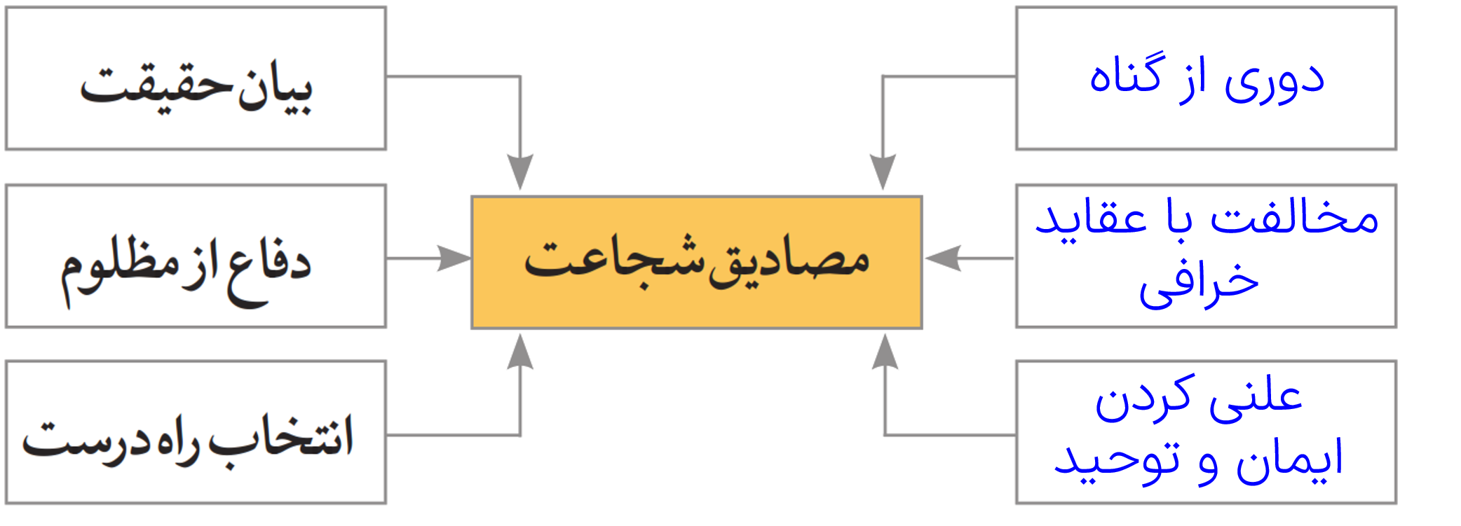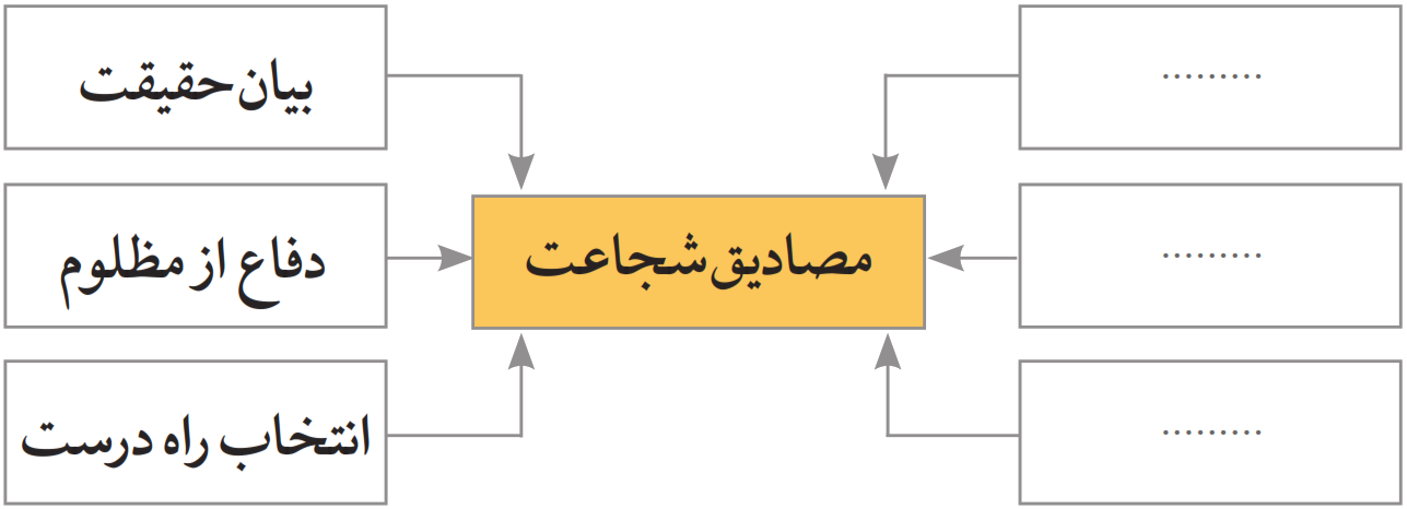 نقشهٔ مفهومی زیر، نمونه های شجاعت است. نقشه را کامل کنید سپس یک مورد را به دلخواه انتخاب کرده و برای آن داستان یا خاطره ای بنویسید. می توانید به سلیقهٔ خود، نقشه دیگری را طراحی کنید.