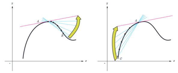 شیب خط مماس بر منحنی در نقطه A حد شیب خط های قاطع گذرنده از A است به شرطی که نقطه ها به قدر کافی به A نزدیک شوند.