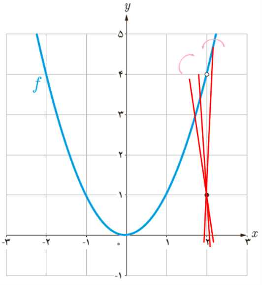شیب خط های قاطع که از نقطۀ \(x = 2\) می گذرند، به عدد حقیقی و منحصر بفردی میل نمی کنند: