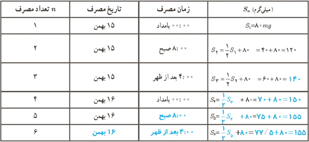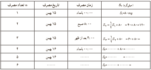 بنابراین، با فرض این مسئله A=80mg مجموع میزان آنتی بیوتیک پس از n بار مصرف: