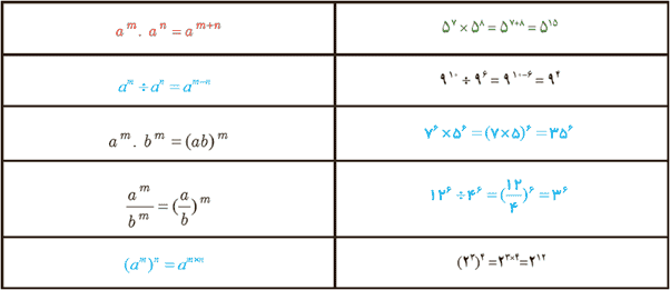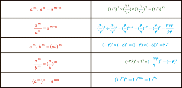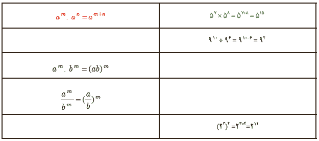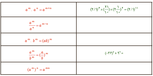 2 الف مانند نمونه، حاصل هر یک از عبارت های زیر را به صورت عدد توان دار بنویسید و در جدول در جای مناسب قرار دهید. (m و n اعداد صحیح و a و b اعداد حقیقی مخالف صفرند.)