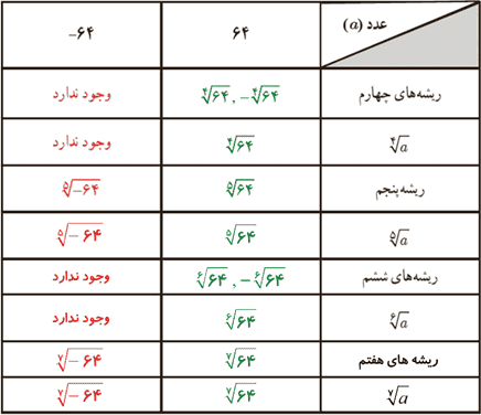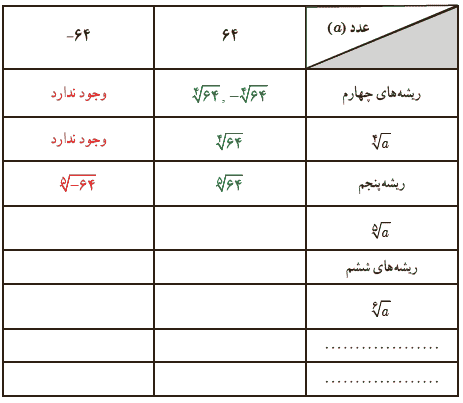 با همین استدلال، ریشهٔ پنجم عدد 32-، پاسخ معادلهٔ x5=-32 است که برابر _____ و ریشه های ششم عدد 64 ، ریشه های معادلهٔ x6=___ هستند که برابر 2+ و 2- می باشند.
