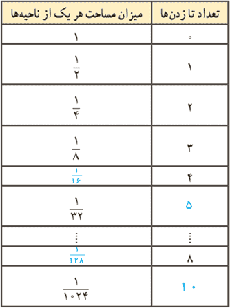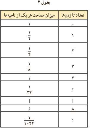 یک صفحه کاغذ سفید را انتخاب کنید و آن را به دو قسمت مساوی تا بزنید. بعد از تا زدن، دو ناحیه به وجود می آید که مساحت هر یک، نصف مساحت اولیه است. اکنون کاغذ تا شده را یک بار دیگر تا بزنید. در دومین تا زدن، چهار ناحیه ایجاد می شود که مساحت هر کدام از آنها، نصف مساحت قبلی، یعنی \(\frac{1}{4}\) مساحت اولیه است. در جدول 3 چگونگی تغییر مساحت ناحیه هایی که بر اثر تا زدن های متوالی ایجاد می شوند، نشان داده شده است.