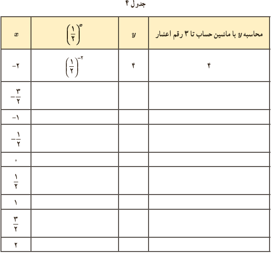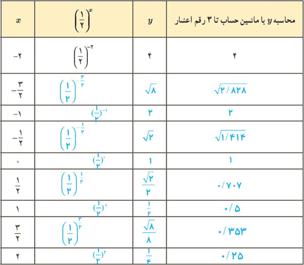1 تابع \(y = {\left( {\frac{1}{2}} \right)^x}\) را در نظر بگیرید و با استفاده از ماشین حساب، جدول زیر را کامل کنید.