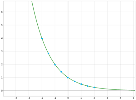 2 نقاط به دست آمده در جدول بالا را روی صفحهٔ مختصات به دست آورید و به هم وصل کنید. آیا می توانید به کمک نمودار، مقدار تابع \({\left( {\frac{1}{2}} \right)^x}\) را برای هر عدد دلخواه x حدس بزنید؟