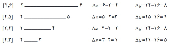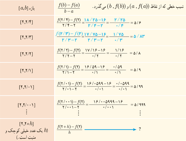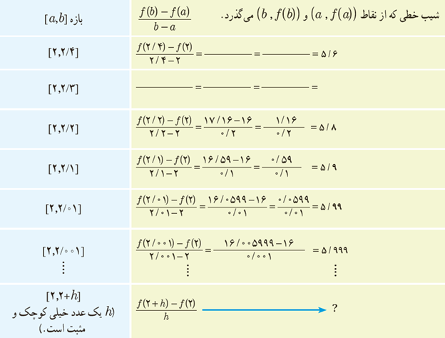 اگر به همین ترتیب بازه های کوچک تری در نظر بگیریم، شیب خطوط به دست آمده به شیب خط مماس بر منحنی در نقطه A نزدیک می شود. برای درک بهتر این موضوع، با تکمیل جدول و مقایسه شیب خط های قاطع، شیب خط مماس را حدس بزنید.