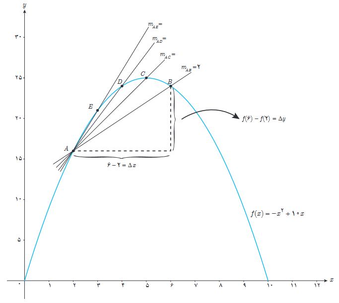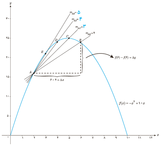 الف تابع \(f\left( x \right) = - {x^2} + 10x\) داده شده است، اگر \(0 \le x \le 10\) نقاط \(A(2,f(2)) \)، \(B(6,f(6))\)، \(C(5,f(5))\)، \(D(4,f(4))\) و \(E(3,f(3))\) را روی منحنی در نظر می گیریم. شیب خطی که از نقاط A و B می گذرد یعنی mAB از دستور زیر به دست می آید: