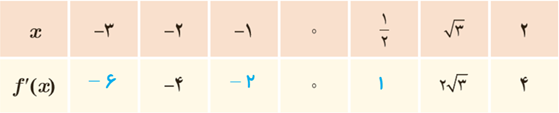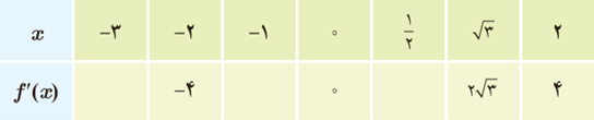 الف جدول زیر را کامل کنید (مشتق تابع در برخی نقاط حساب شده اند).
