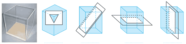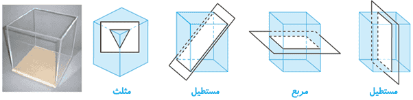 الف بعضی از حالت های برخورد یک صفحه با یک مکعب مستطیل توخالی با قاعدهٔ مربع شکل، در زیر نمایش داده شده است. در هر یک از حالت ها سطح مقطع را مشخص کنید.