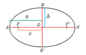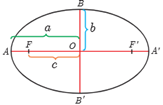 بیضی مقابل را در نظر بگیرید. اندازهٔ پاره خط های OA، OB و OF را به ترتیب با a، b و c نمایش داده ایم. می دانیم که مجموع فواصل هر نقطه از بیضی، از دو کانون بیضی مقداری ثابت است.