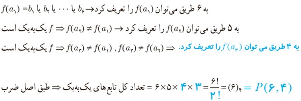 1 اگر فرض کنیم {A={a1,a2,a3,a4 و {B ={b1,b2, ... ,b6 برای تعریف f روی هر عضو A مثلا (f(a1 چند راه انتخاب داریم؟