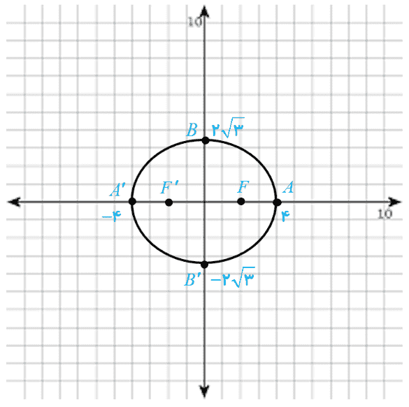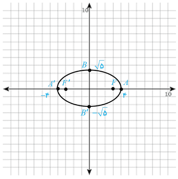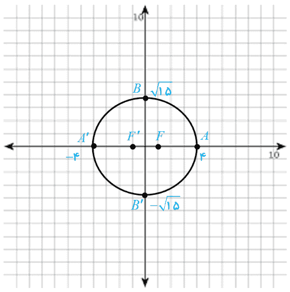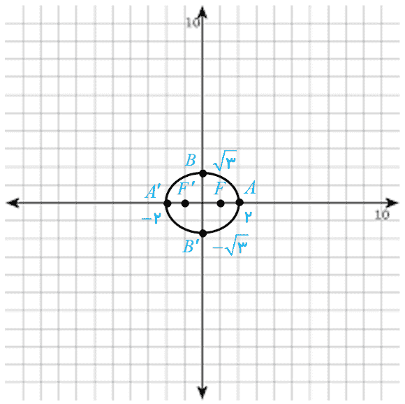 می دانیم که 0 ≤ c ≤ a و لذا \(0 \le \frac{c}{a} \le 1\) دقت کنید که چگونگی میزان کشیدگی بیضی چه ارتباطی با مقدار کسر \(\frac{c}{a}\) دارد. در رسم بیضی به صورت تقریبی ابتدا دو کانون F و ′F را به فاصله 2c از هم در نظر بگیرید، سپس نقاط A و ′A را بر خط ′FF به گونه ای انتخاب کنید که فاصله A تا F و فاصله ′A تا ′F برابر a-c و اندازه ′AA برابر 2a باشد، سپس با استفاده از رابطه \({b^2} = {a^2} - {c^2}\) نقاط B و ′B را مشخص کنید و بیضی را به طور تقریبی رسم کنید: