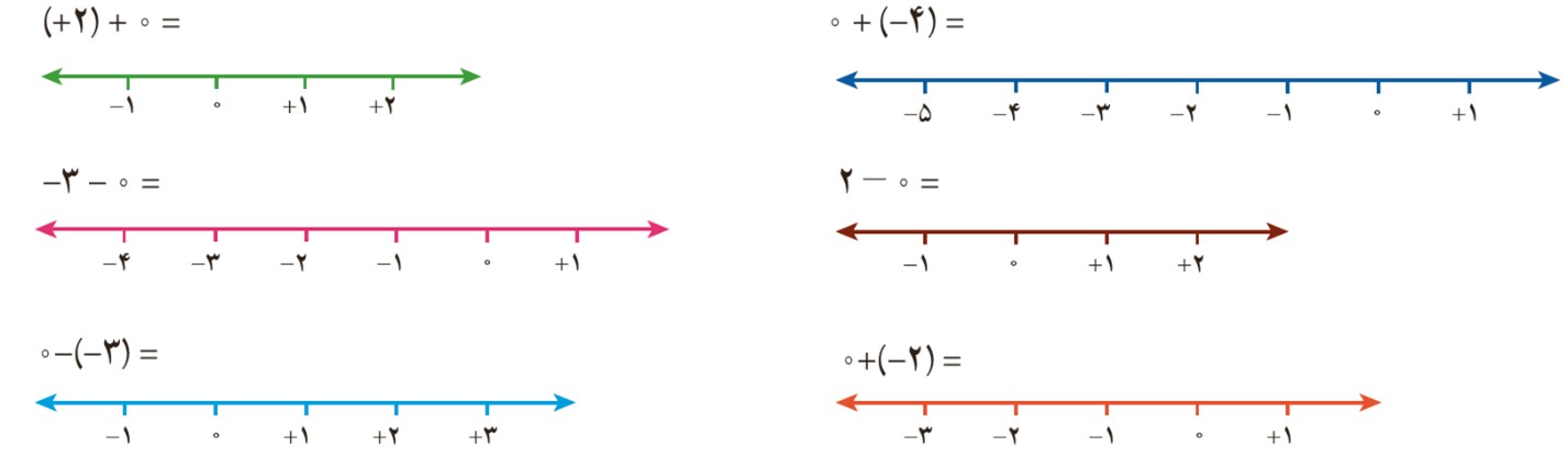 2 جمع و تفریق ها را روی محور نشان دهید و حاصل را به دست آورید. ابتدا تفریق را به صورت جمع بنویسید.
