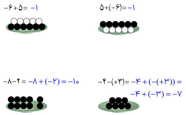 نتیجه: اگر هردو عدد منفی باشند، بدون در نظر گرفتن علامت دو عدد را با هم جمع کرده و در انتها، قرینۀ حاصل جمع را برای نتیجه می نویسیم.