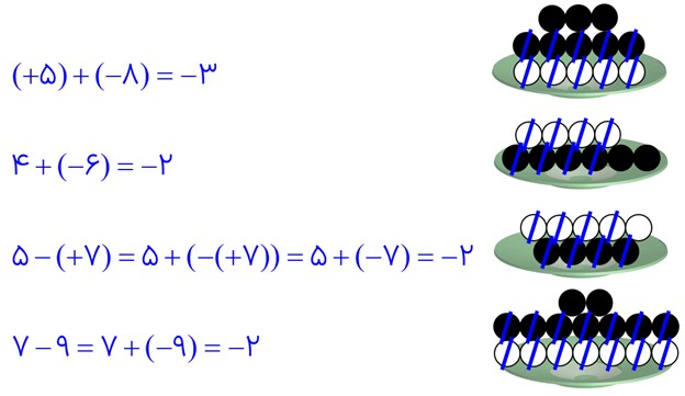 نتیجه: اگر در جمع دو عدد صحیح، یکی از دو عدد ،مثبت و دیگری منفی باشد و بدون در نظر گرفتن علامت ها مقدار مثبت بیشتر باشد، عدد کوچکتر را از عدد بزرگتر کم کرده و برای حاصل، علامت مثبت را می گذاریم.