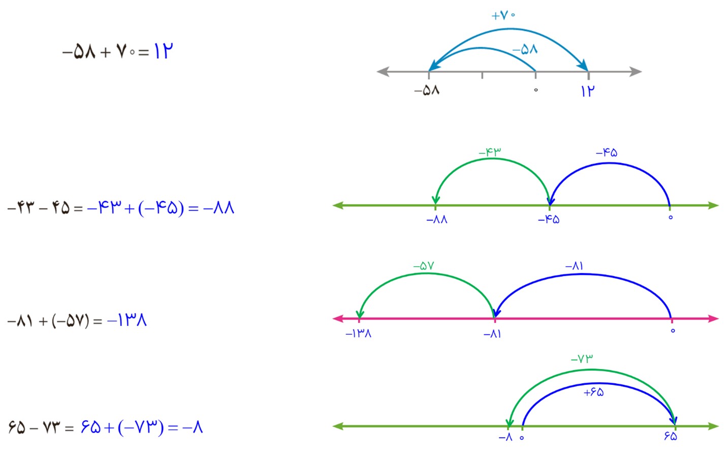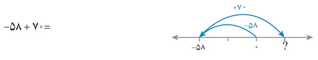 1 در این نمونه به کمک محور و به صورت تقریبی محل جواب و علامت آن تعیین می شود و از روی حرکت پیکان (پیکانه) می توان روش محاسبه را حدس زد. با توجه به شکل، حاصل، مثبت و جواب \(75-58 = 12\) است.