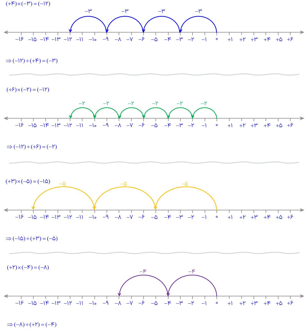 ضرب های زیر را ابتدا با محور نشان دهید؛ سپس تقسیم های متناظرشان را بنویسید.
