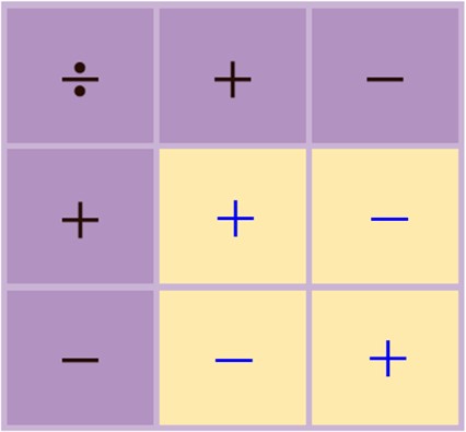 \(\begin{array}{l}( + 3) \times ( - 5) = ( - 15)\\\\( - 15) \div ( - 5) = ( + 3)\end{array}\)