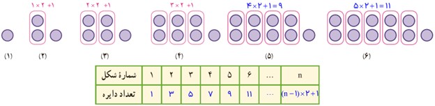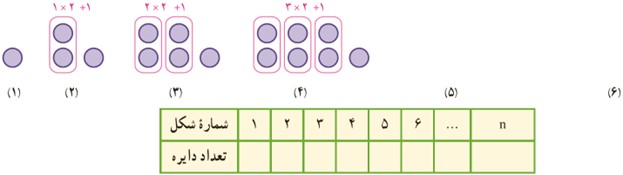 2 اکنون با توجه به شکل های زیر و الگویی که مشاهده می کنید، ابتدا شکل پنجم و ششم را رسم و سپس جدول را کامل کنید.