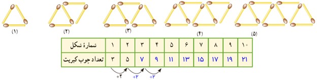 ب با توجه به الگویی که در جدول مشاهده می کنید، توضیح دهید چه رابطه ای بین شمارهٔ شکل و تعداد چوب کبریت ها وجود دارد؟