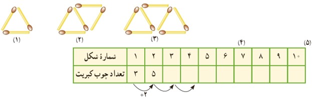 3 الف شکل های زیر با چوب کبریت درست شده اند و به همین ترتیب ادامه پیدا می کنند. با توجه به الگوی آنها جدول را کامل کنید.