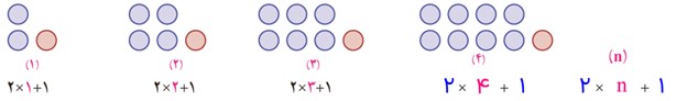 در هر شکل، تعداد دایره ها از دو برابر شمارۀ شکل، یک واحد بیشتر است:
