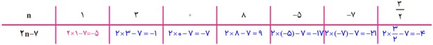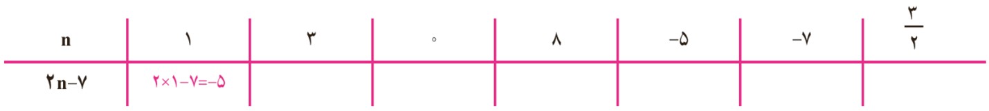 3 عبارت 2n-7 را به ازای عددهای داده شده پیدا کنید. مانند نمونه راه حل را بنویسید.