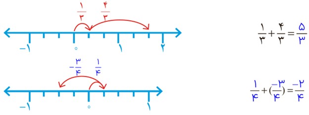 برای جمع دو عدد گویا با مخرج یکسان، صورتها را با هم جمع کرده و مخرج مشترک را در نتیجه حفظ میکنیم.