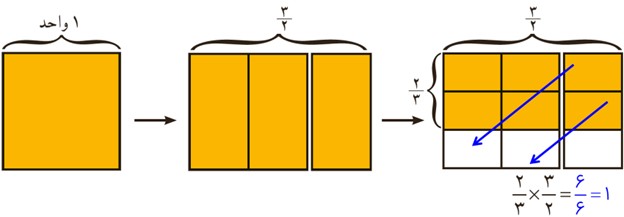 در نهایت، مشاهده میکنیم که دو قسمت رنگشده، وقتی کنار هم قرار بگیرند، یک مربع کامل را میسازند. این مربع معادل همان یک واحد کامل است که در ابتدا داشتیم. به این ترتیب، شکل به صورت بصری ثابت میکند که حاصل ضرب یک کسر در معکوسش برابر با یک است.