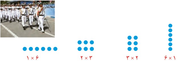 2 تعدادی از سربازان می خواهند رِژه بروند. فرماندهٔ آنها آرایش های مستطیلی مختلف برای گروه های 6 نفره را روی کاغذ کشیده است.