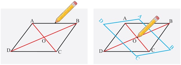 نوک مدادتان را روی نقطهٔ O (محل برخورد قطر ها و مرکز تقارن شکل) قرار دهید و مانند شکل های زیر، تصویر را 180 درجه حول این نقطه بچرخانید تا بر شکل منطبق شود.
