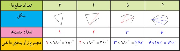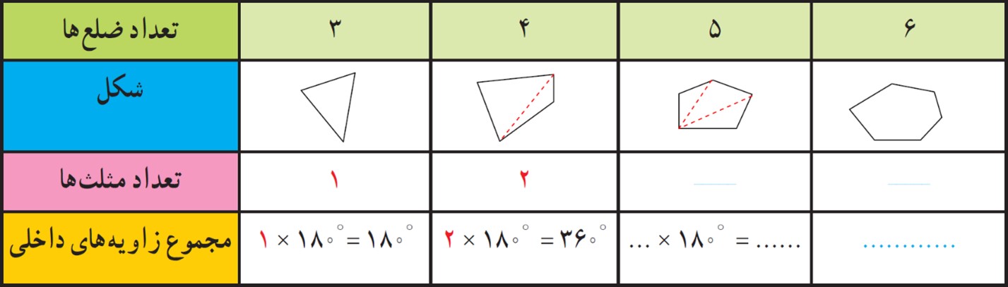 الف با کامل کردن جدول، مجموع زاویه های داخلی چندضلعی های دیگر را به دست آورید.