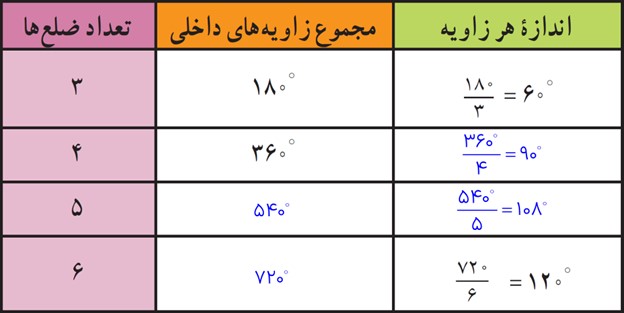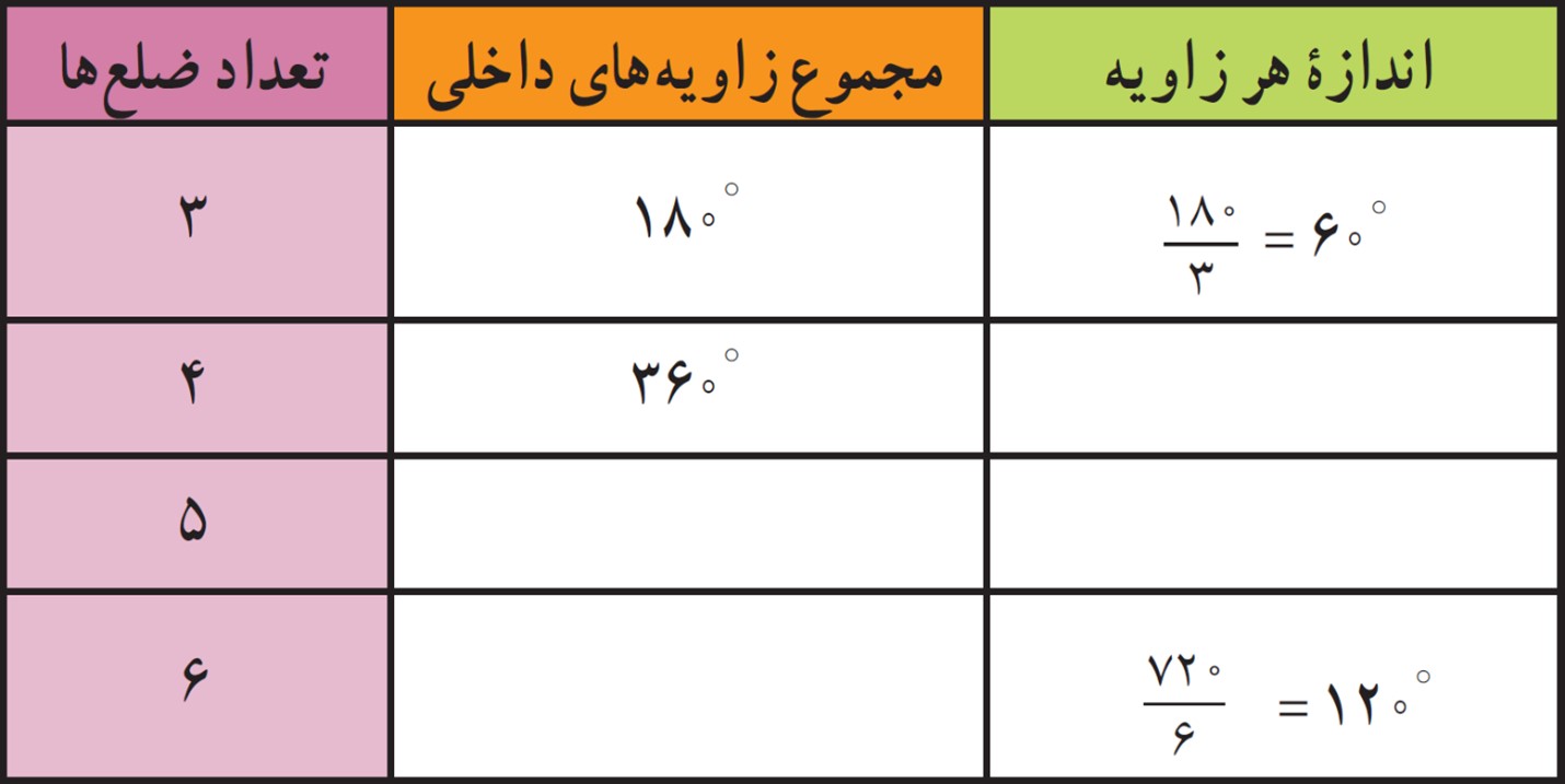اکنون با کامل کردن جدول زیر اندازهٔ هر یک از زاویه های داخلی چندضلعی های منتظم را پیدا کنید.