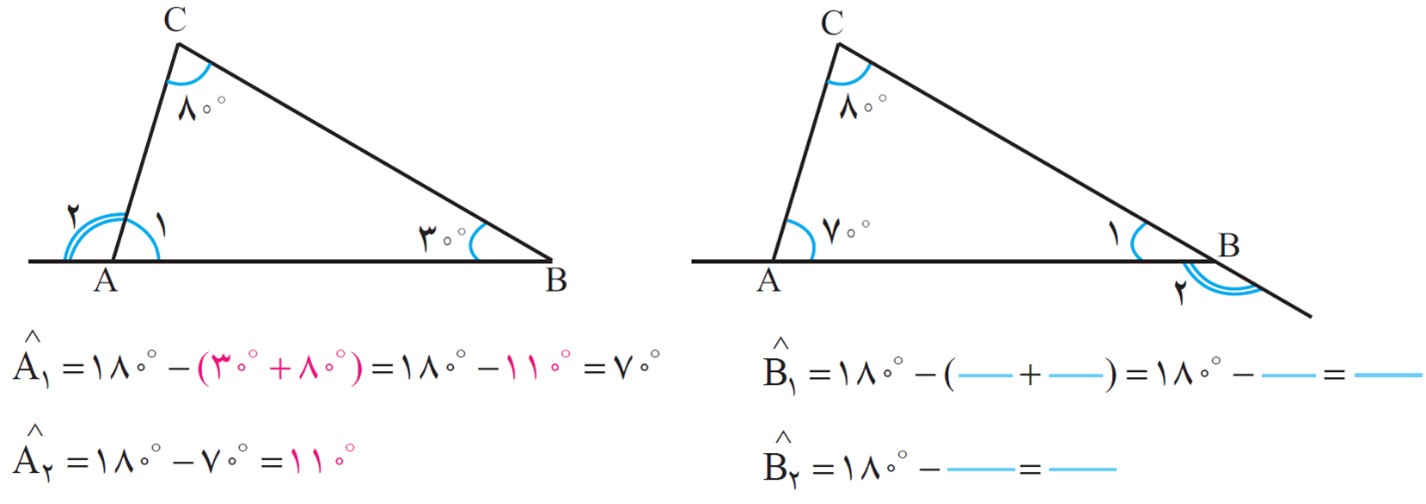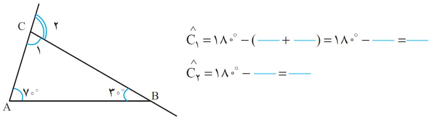 الف هدی برای یافتن زاویهٔ خارجی یکی از رأس های مثلث به ترتیب زیر عمل کرد. راه حل او را کامل کنید.