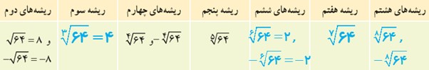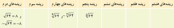 الف مشابه آنچه که برای ریشه های دوم، سوم، چهارم و پنجم گفته شد، می توان برای ریشه های دیگر مثلاً ریشهٔ ششم نیز عمل کرد. جدول زیر را که مربوط به ریشه های مختلف عدد 64 است، کامل کنید.