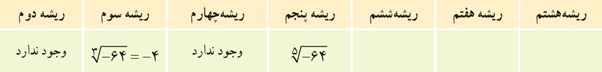 الف جدول زیر را که دربارهٔ ریشه های مختلف عدد 64 - است، تکمیل کنید.